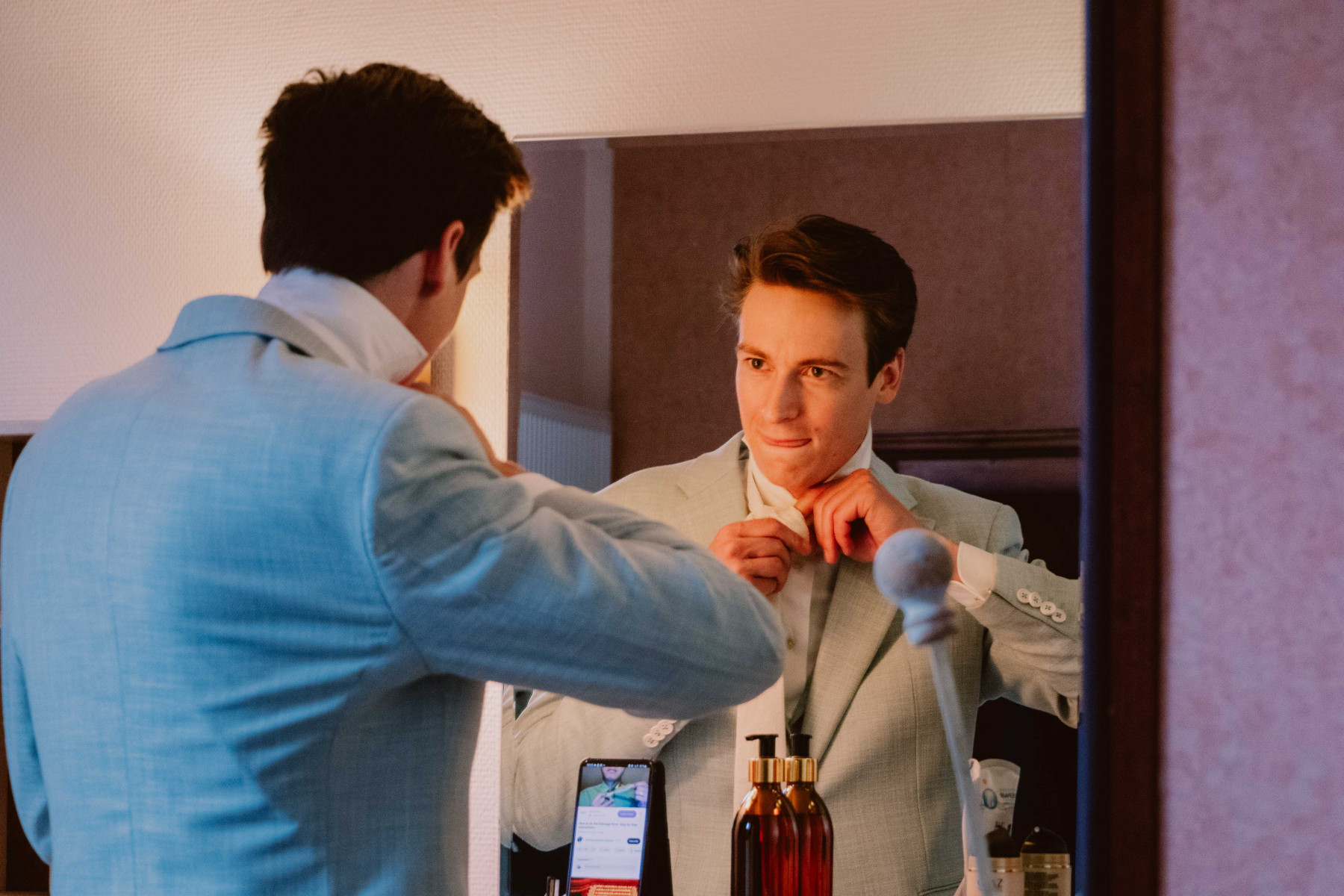 La mariée s'est maquillée elle-même ce jour-là, et c'est avec l'aide de ses témoins qu'elle a enfilé sa magnifique robe blanche. Le marié, quant à lui, a eu besoin d'un petit coup de pouce d'un tuto Youtube pour réaliser son noeud de cravate, afin qu'il soit parfait.